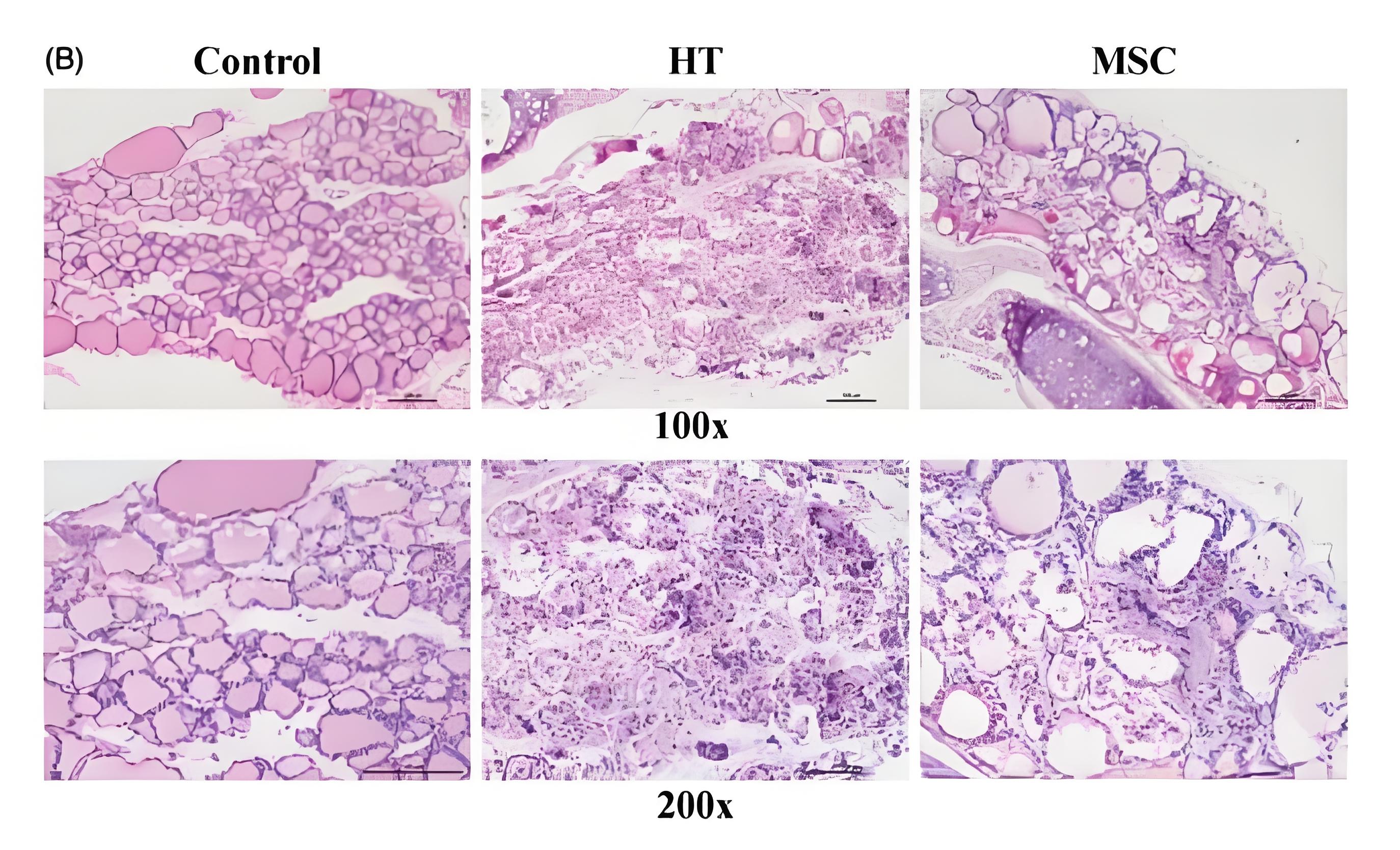 HT模型組甲狀腺濾泡明顯萎縮,MSCs治療組甲狀腺病變減輕,組織結(jié)構(gòu)更為完整。