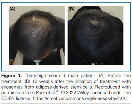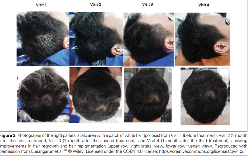一項(xiàng)病例報(bào)告顯示,一名雄激素性脫發(fā)合并局限性白發(fā)的患者,在接受4次皮秒激光治療后,每月接受干細(xì)胞外泌體局部治療。結(jié)果不僅觀察到毛發(fā)再生,白發(fā)區(qū)域的色素沉著也得到恢復(fù)。