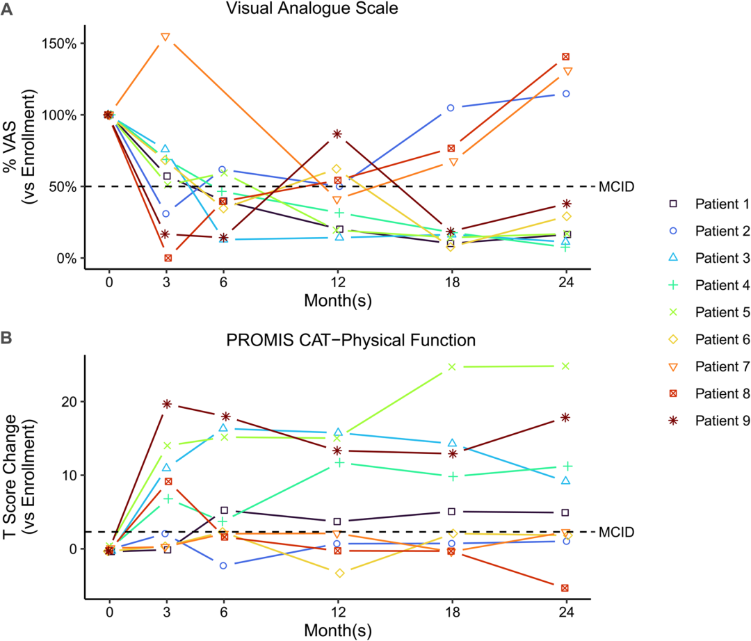 疼痛顯著改善:66.7%的患者在12–24個月隨訪期間,疼痛視覺模擬評分(VAS)下降超過50%,達到臨床有效標準;