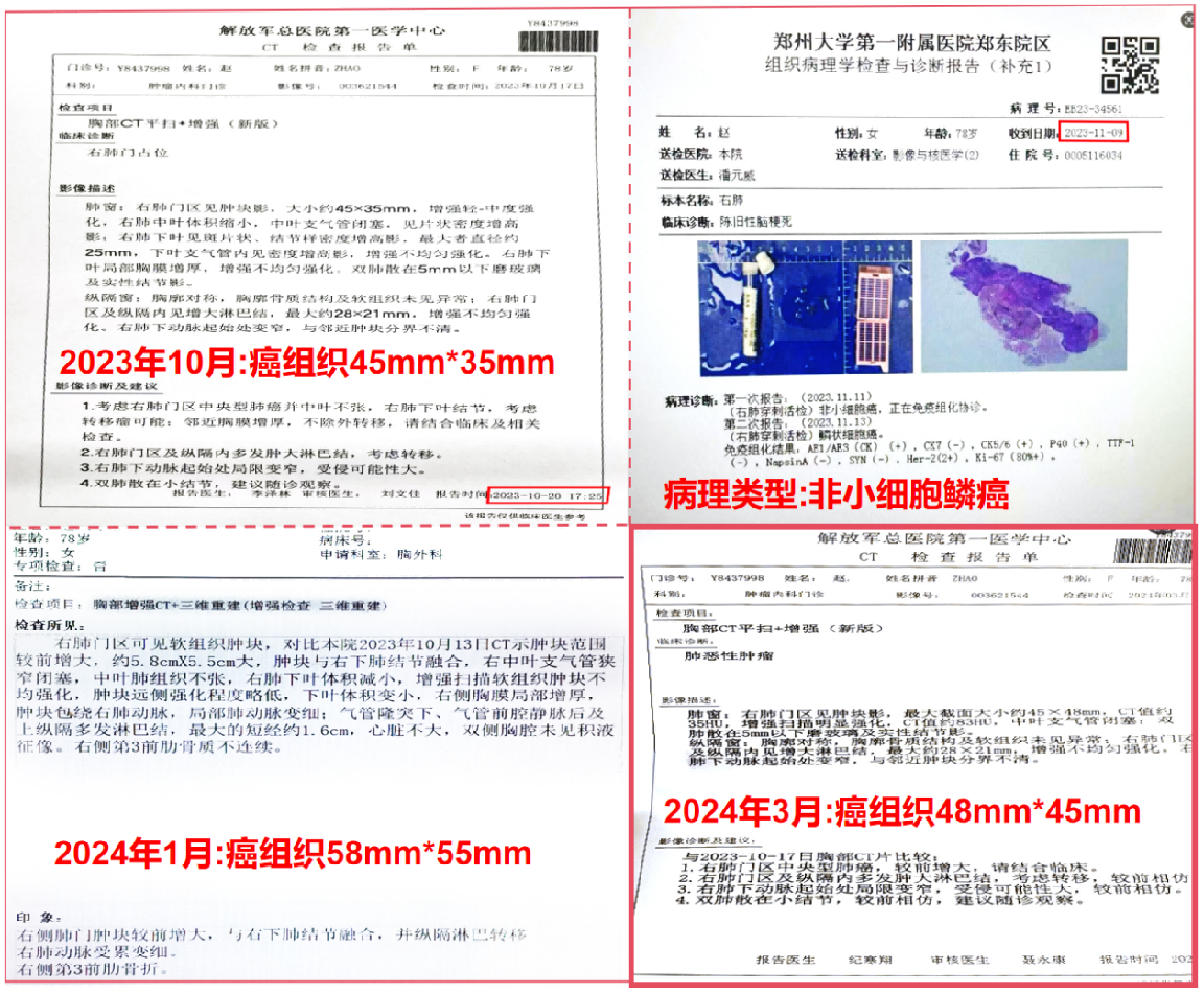 (圖為晚期肺癌患者趙女士所提供檢查報告單:圖一為2023年10月癌組織大小影像報告單,圖二為病理類型臨床診斷單,圖三為2024年1月癌組織大小影像報告單,圖四為2024年3月癌組織大小影像報告單)