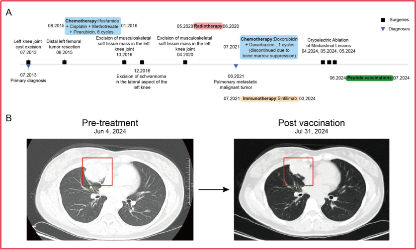 臨床研究案例三:某患者2013年8月初診斷為惡性外周神經鞘瘤,2015年8月復發再次手術,2020年4月確診為滑膜肉瘤,2021年6月轉移至肺部,詳見下圖—2024年7月4日肺部影像圖。該患者經過三周細胞免疫治療和干預后,肺部轉移灶影像顯著縮小三分之一(見下對比圖:2024年7月31日肺部影像)。同時食欲明顯增強,精神狀態也明顯改觀,身體機能逐步在恢復之中。