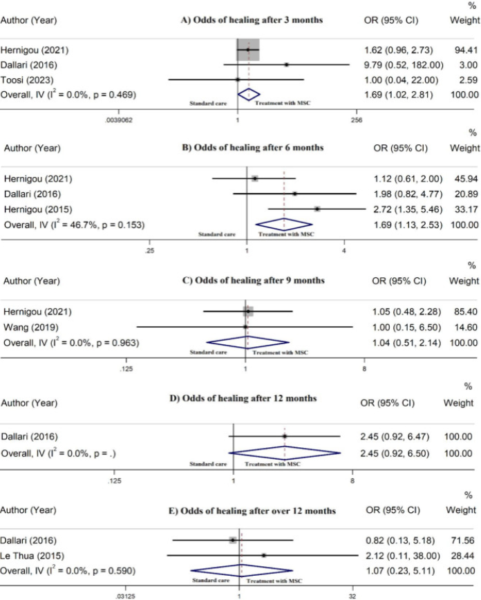 (圖為接受間充質(zhì)干細(xì)胞患者在治療后3個(gè)月(A)、6個(gè)月(B)、9個(gè)月(C)、12個(gè)月(D)及超過12個(gè)月(E)時(shí)骨骼愈合概率的薈萃分析)