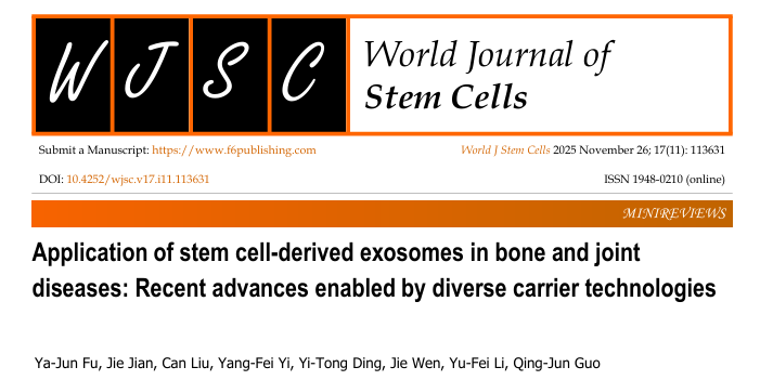 一篇題為《干細胞來源外泌體在骨關節疾病中的應用:多種載體技術推動的最新進展》的綜述論文在國際權威期刊《World Journal of Stem Cells》(世界干細胞雜志,2025 年 11 月 26 日第 17 卷第 11 期)正式發表。該研究由湖南師范大學、河北醫科大學、湖南省人民醫院等多家機構的科研團隊聯合完成,系統梳理了干細胞外泌體結合載體技術在骨關節炎、類風濕關節炎、痛風性關節炎等疾病治療中的最新成果,為這類高發且難治的疾病提供了全新的治療思路。