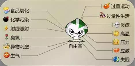 衰老的自由基學說是Denham Harman在1956年提出的。科學研究表明,衰老或其它疾病大都與過量自由基的產生有關聯。人體過度氧化的危害會加速衰老、疾病、引發炎癥、自身免疫反應而使身體健康遭受破壞,產生色素沉著,色斑出現。