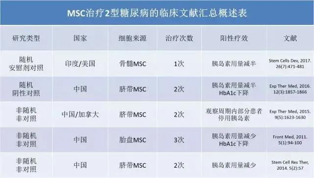 2型糖尿病的發(fā)病機(jī)制復(fù)雜,病情進(jìn)展到體內(nèi)胰島素相對不足之時,需要額外注射胰島素治療。目前,MSC治療2型糖尿病的出發(fā)點(diǎn)在于,經(jīng)過MSC治療后,患者是否能擺脫胰島素治療?當(dāng)然,治愈糖尿病依然是一個未來的終極目標(biāo)。MSC治療2型糖尿病的總體概括見下表。
