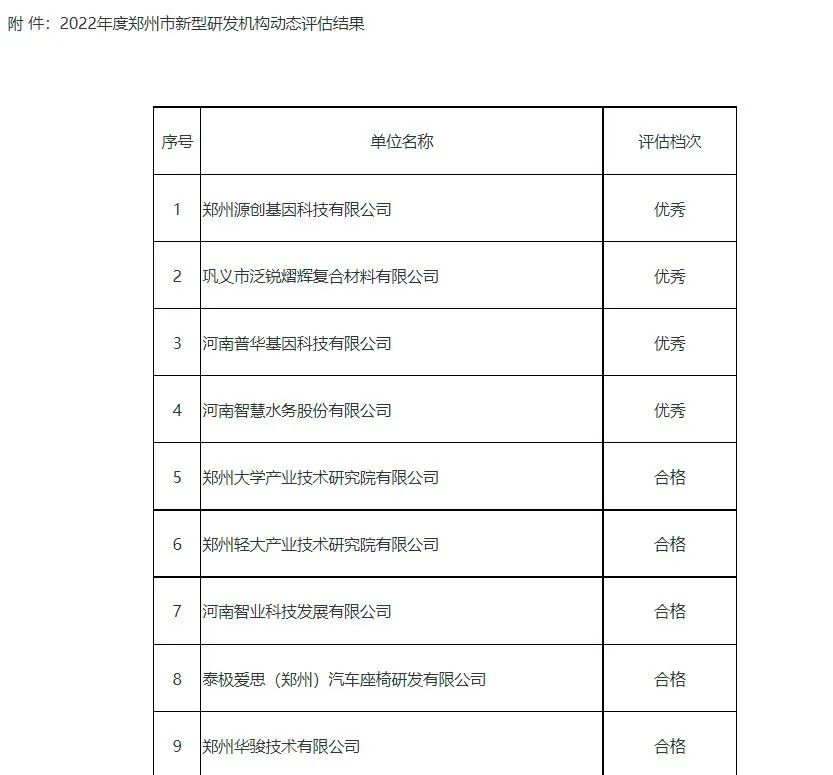 根據《鄭州市人民政府辦公廳關于印發鄭州市推動新型研發機構高質量發展管理辦法的通知》(鄭政辦〔2021〕45號)有關要求,市科技局組織開展了2022年度鄭州市新型研發機構動態評估。源創基因在“2022年度鄭州市新型研發機構動態評估”中榮獲“優秀”。