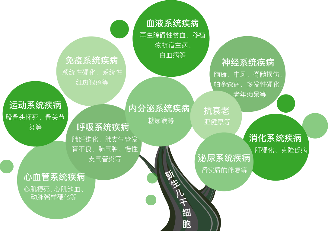 目前臨床研究中已發現的可用新生兒干細胞治療的疾病有140余種,作為種子細胞它可應用于修復/替代受損或病變的多種組織器官。